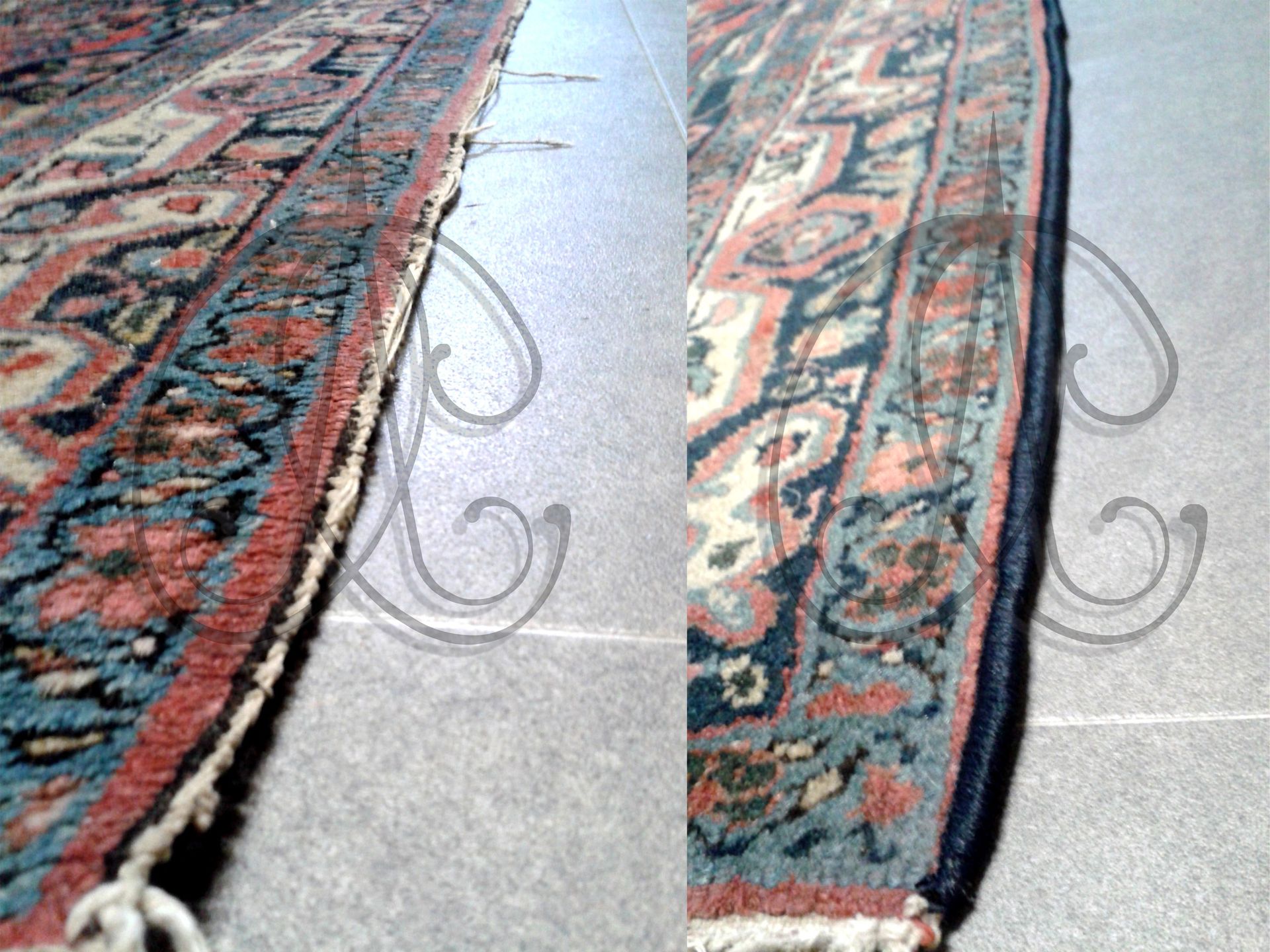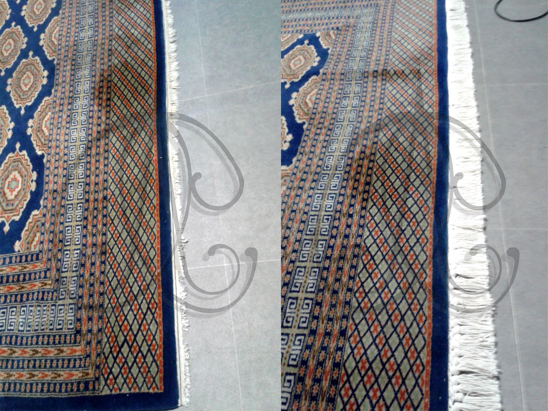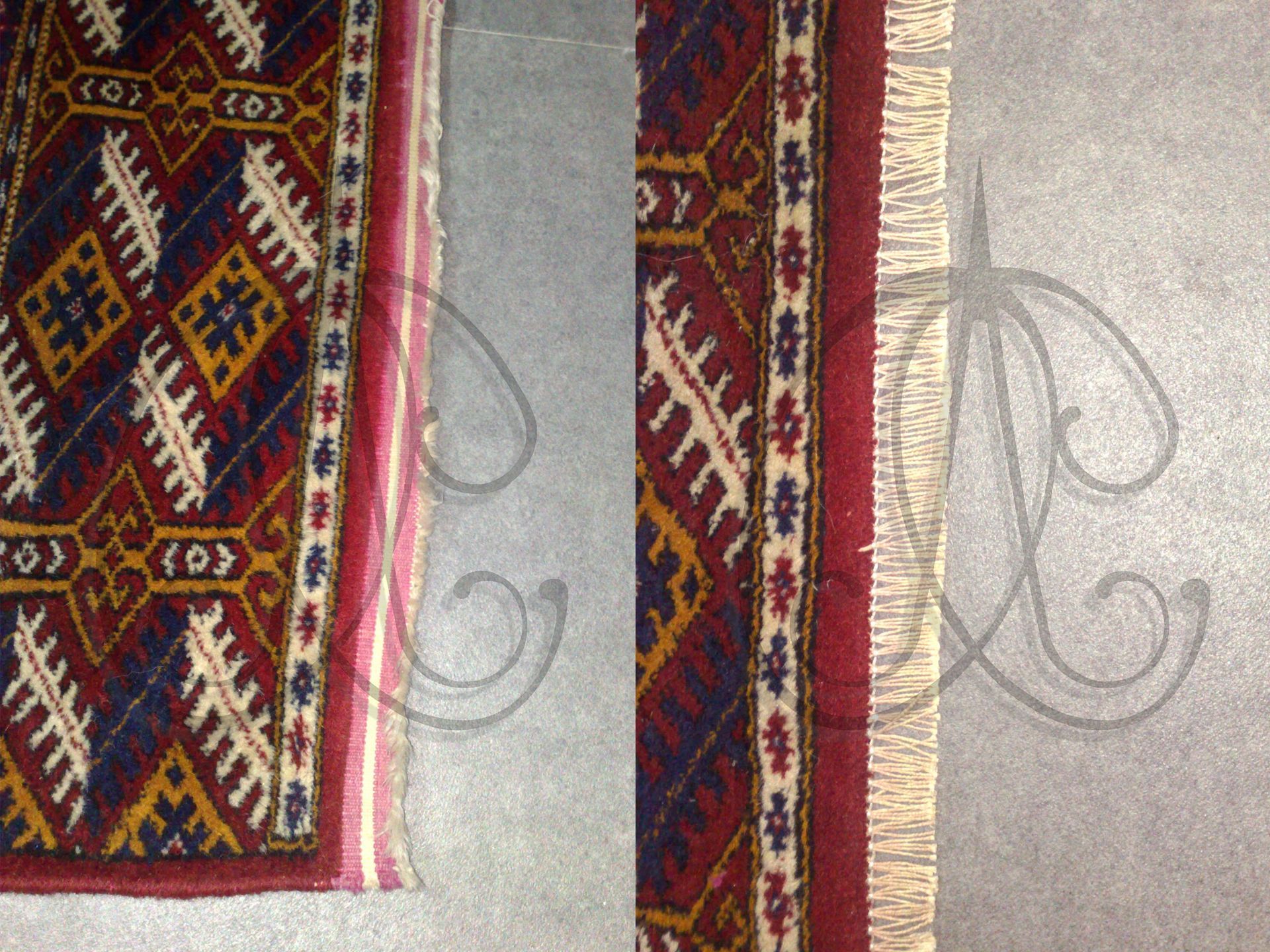 Specialized in the restoration of oriental carpets for many years, we repair all types of valuable and mechanical carpets by hand : removal or repair of fringes, edge damaged by hand or mechanically, holes.